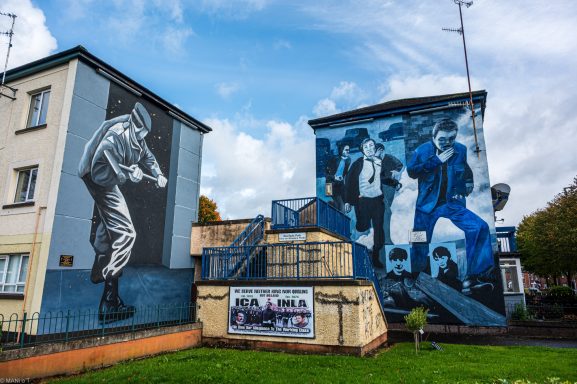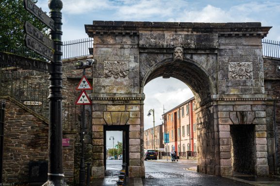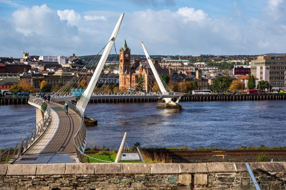 Blick auf die Peace Bridge. Derry ist die einzige vollständig ummauerte Stadt Irlands und bekannt für seine Murals im Bogside Viertel.