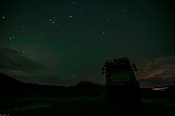 Gut zu sehen der Sternehaufen "Plejaden" in der Mitte oben und das Sternbild "Orion" am linken Bildrand.