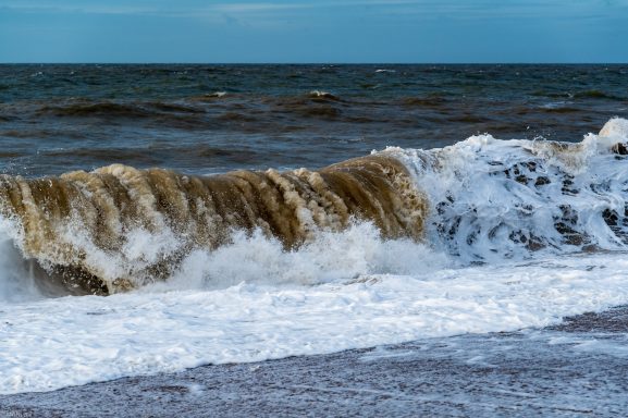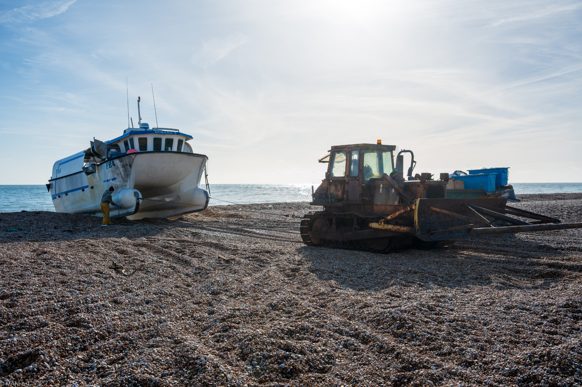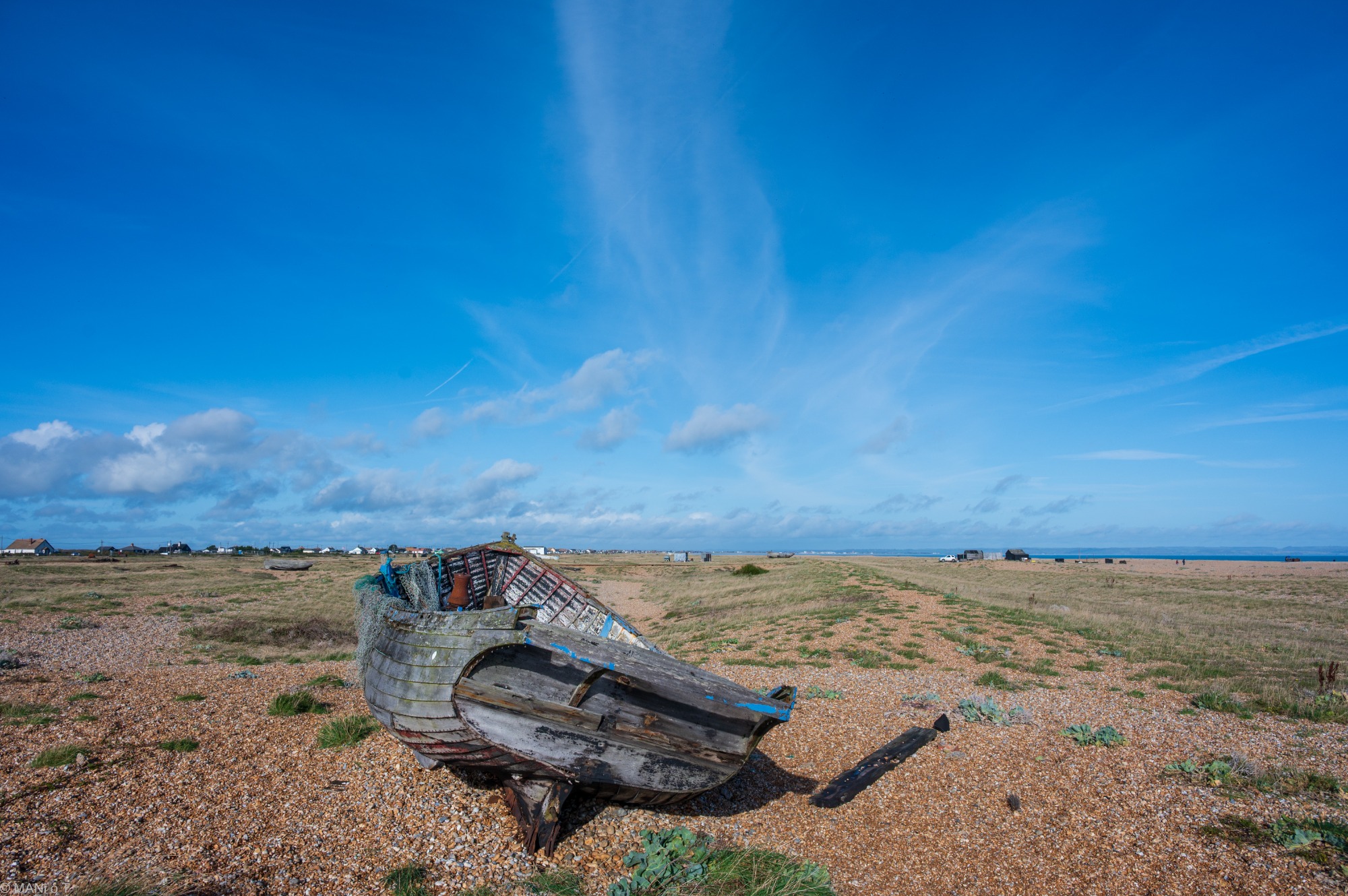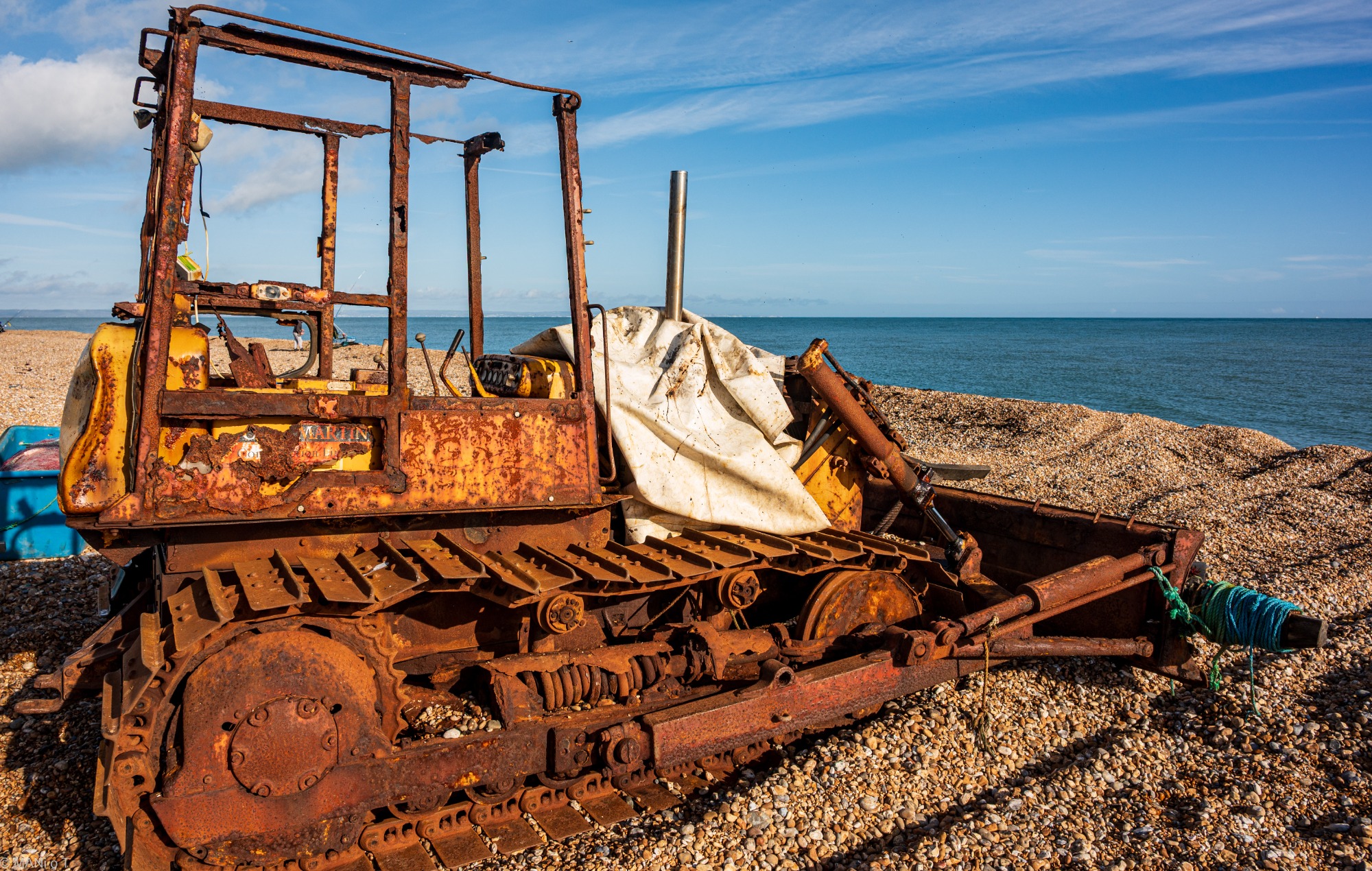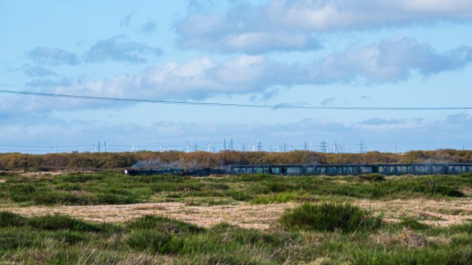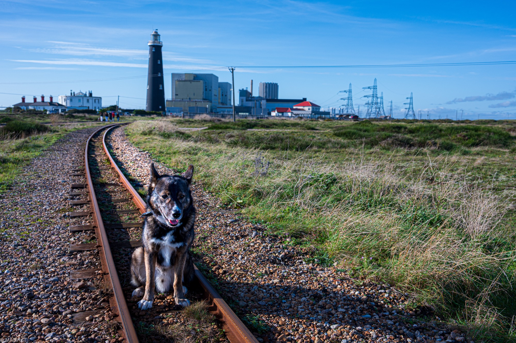 Einer der längsten Kiesstrände in einem Naturreservat mit Kernkraftwerk, Schmalspurbahn und Schrottreifen Kettenfahrzeugen am Strand.